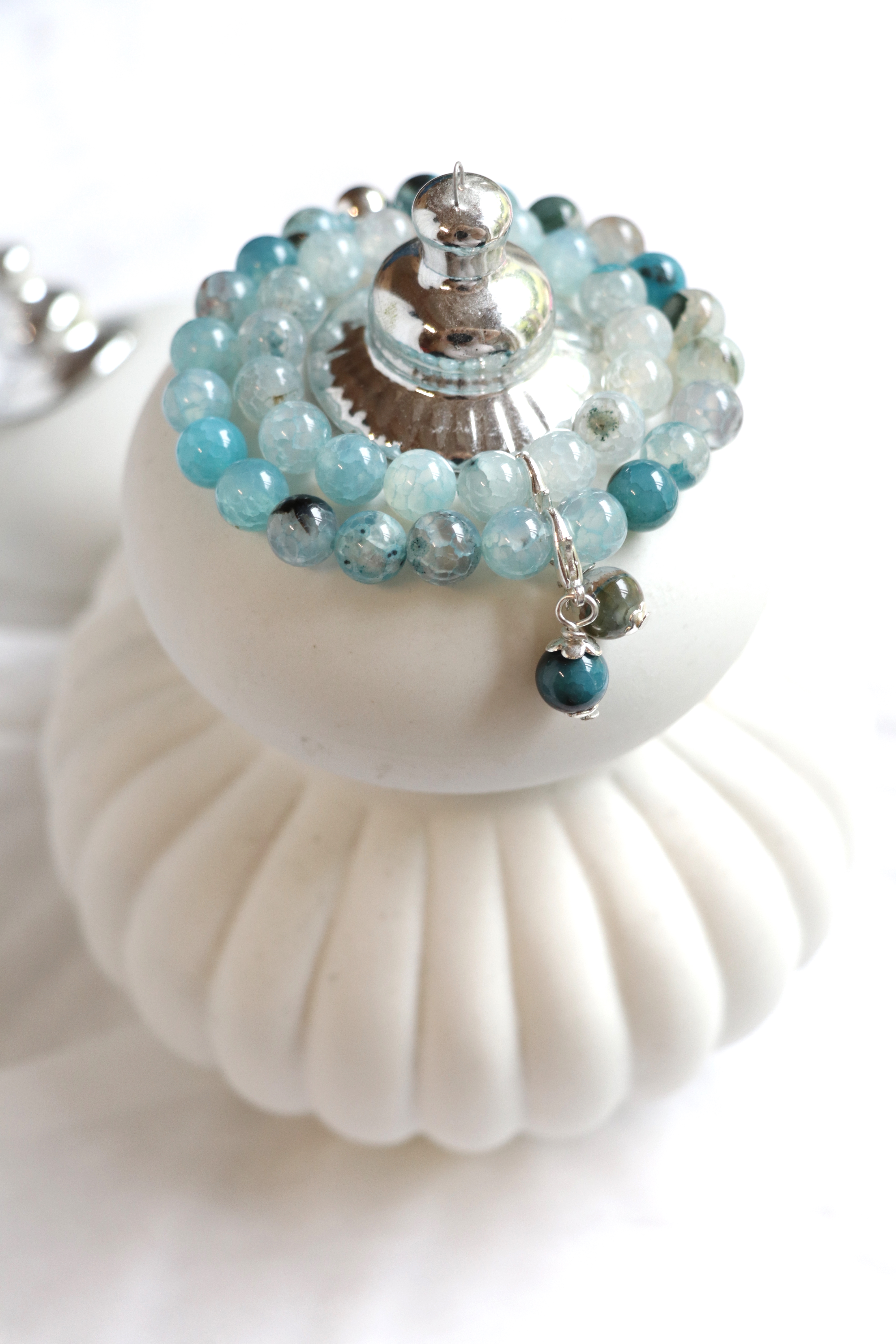 Die 2 Armbänder sind aus polierten Achat-Perlen hergestellt. Beide Armbänder haben einen Anhänger mit Karabiner-Verschluss. Dieser kann auch weggenommen und an eine Kette gehängt werden.