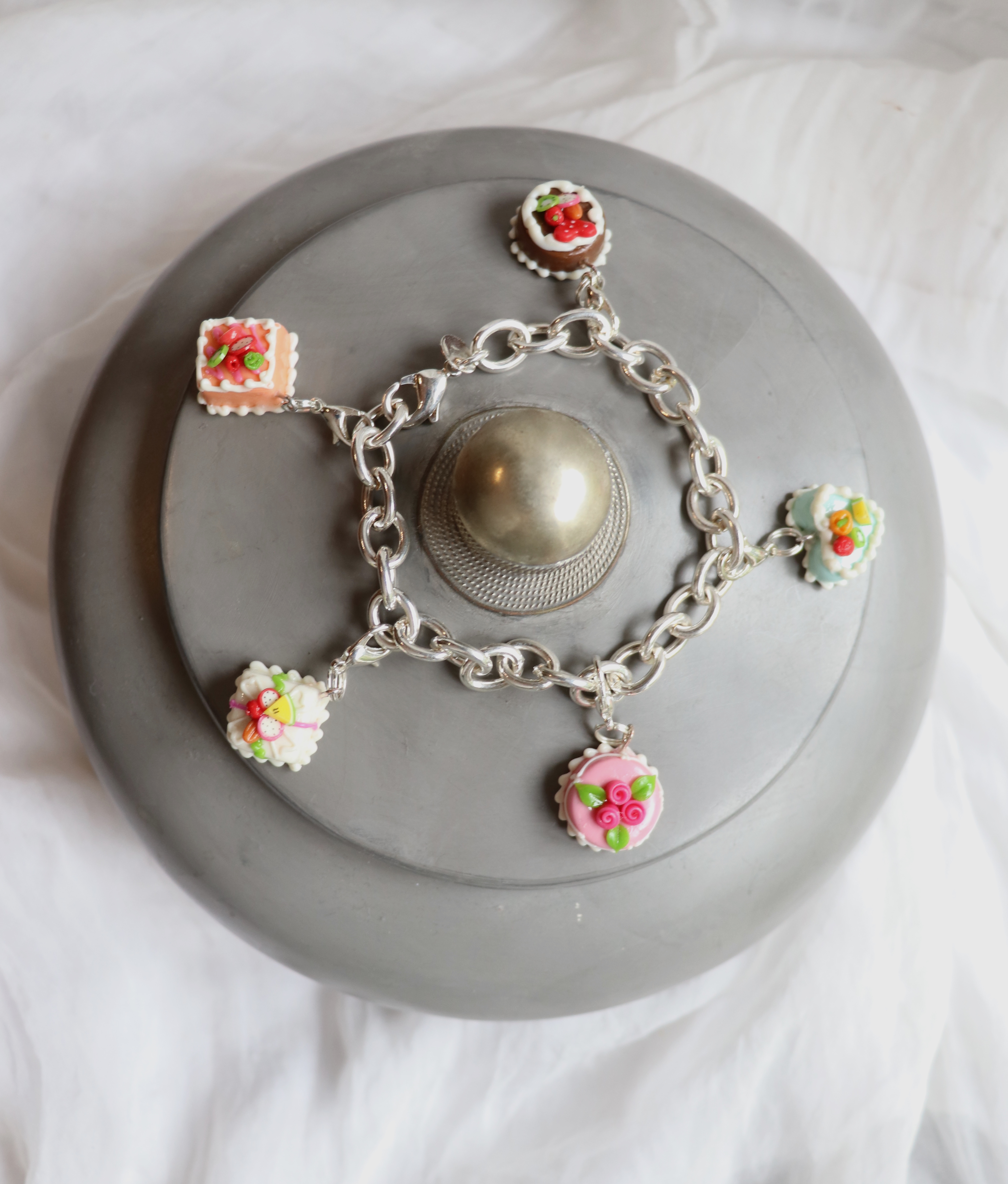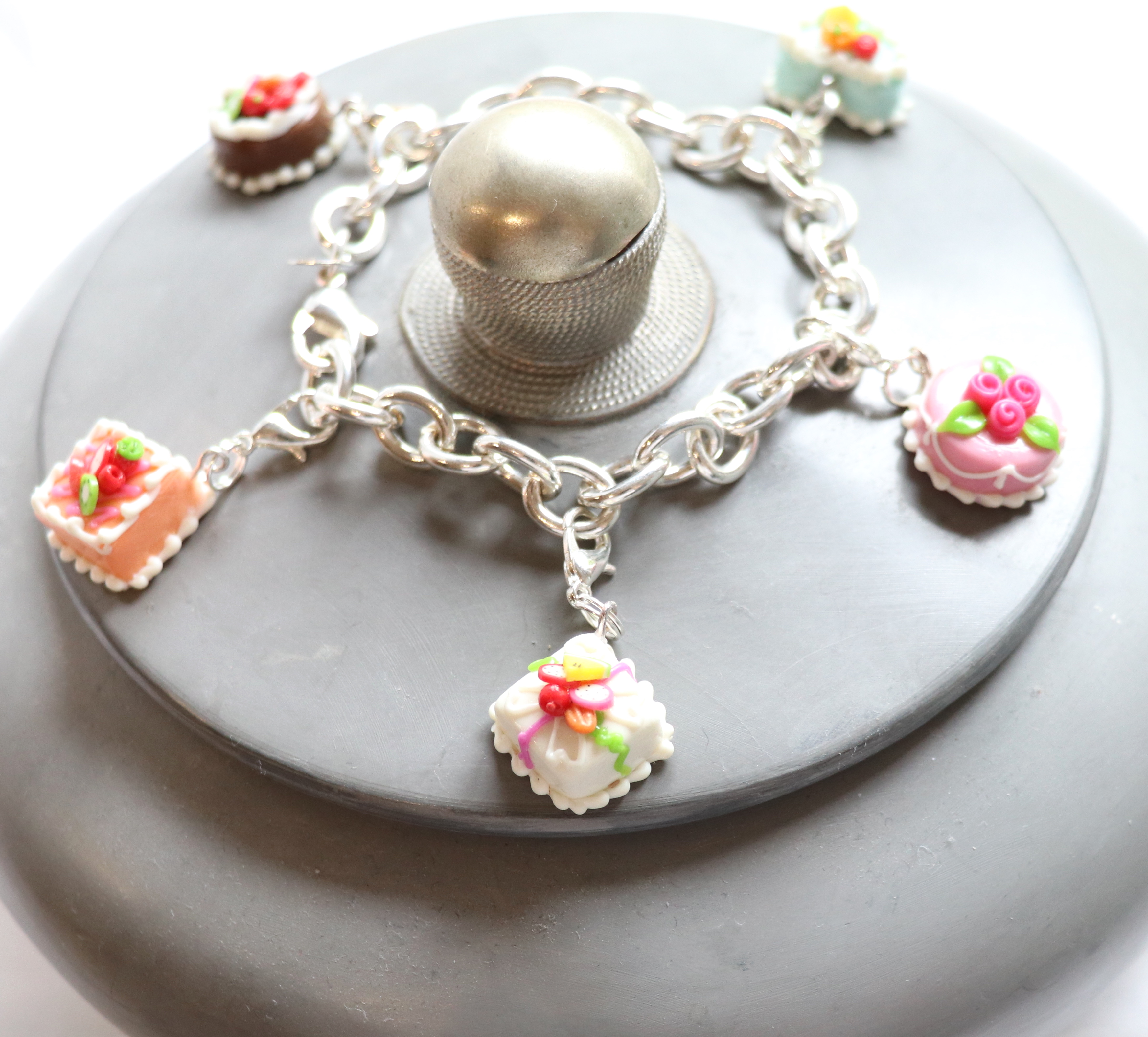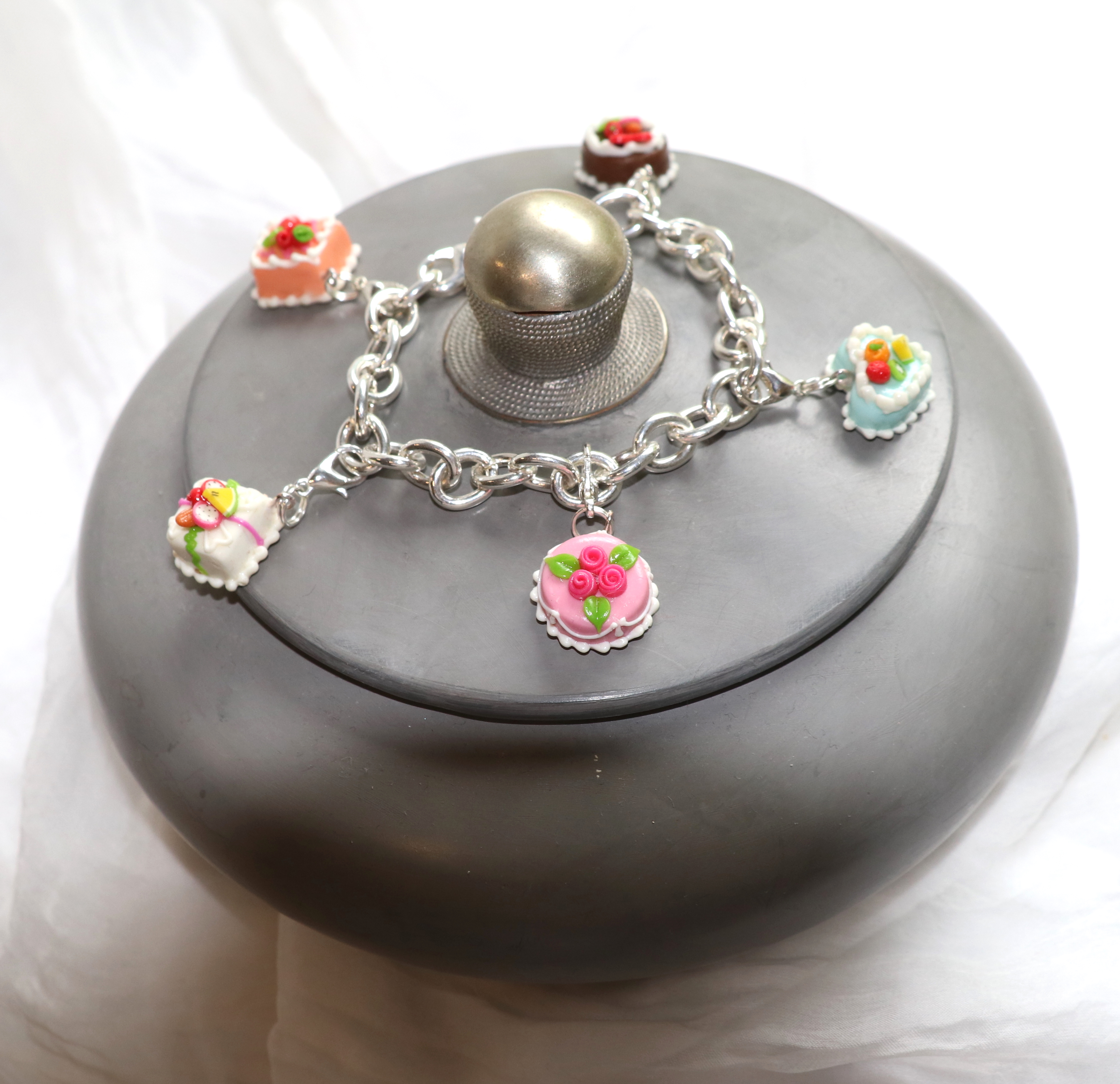 Wunderschönes Armband mit Süssigkeiten. Jedes der Anhänger hat einen Karabinerverschluss. So kann es abgenommen werden und z.B. an eine Kette angebracht werden.