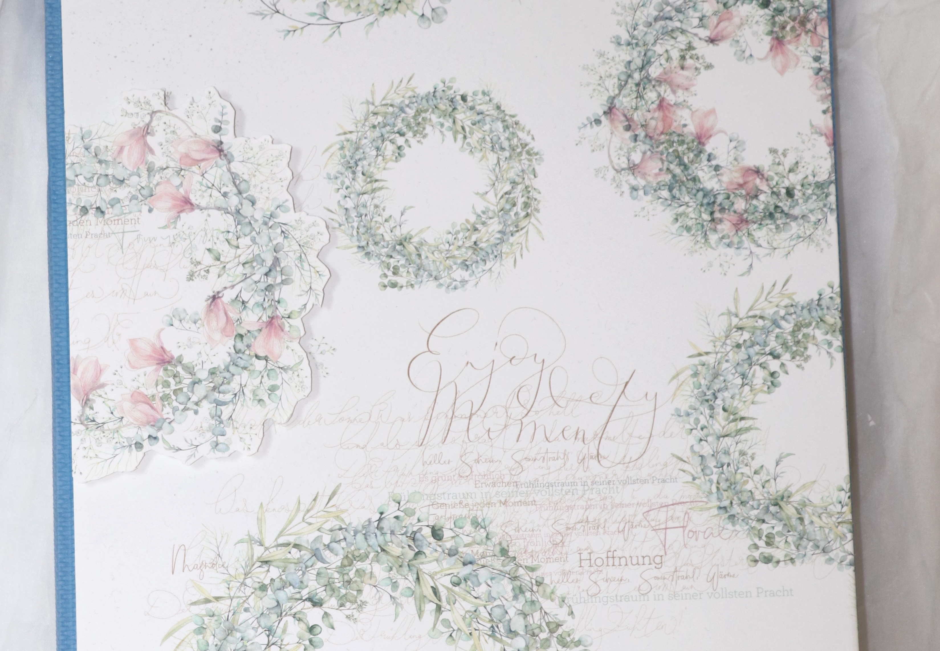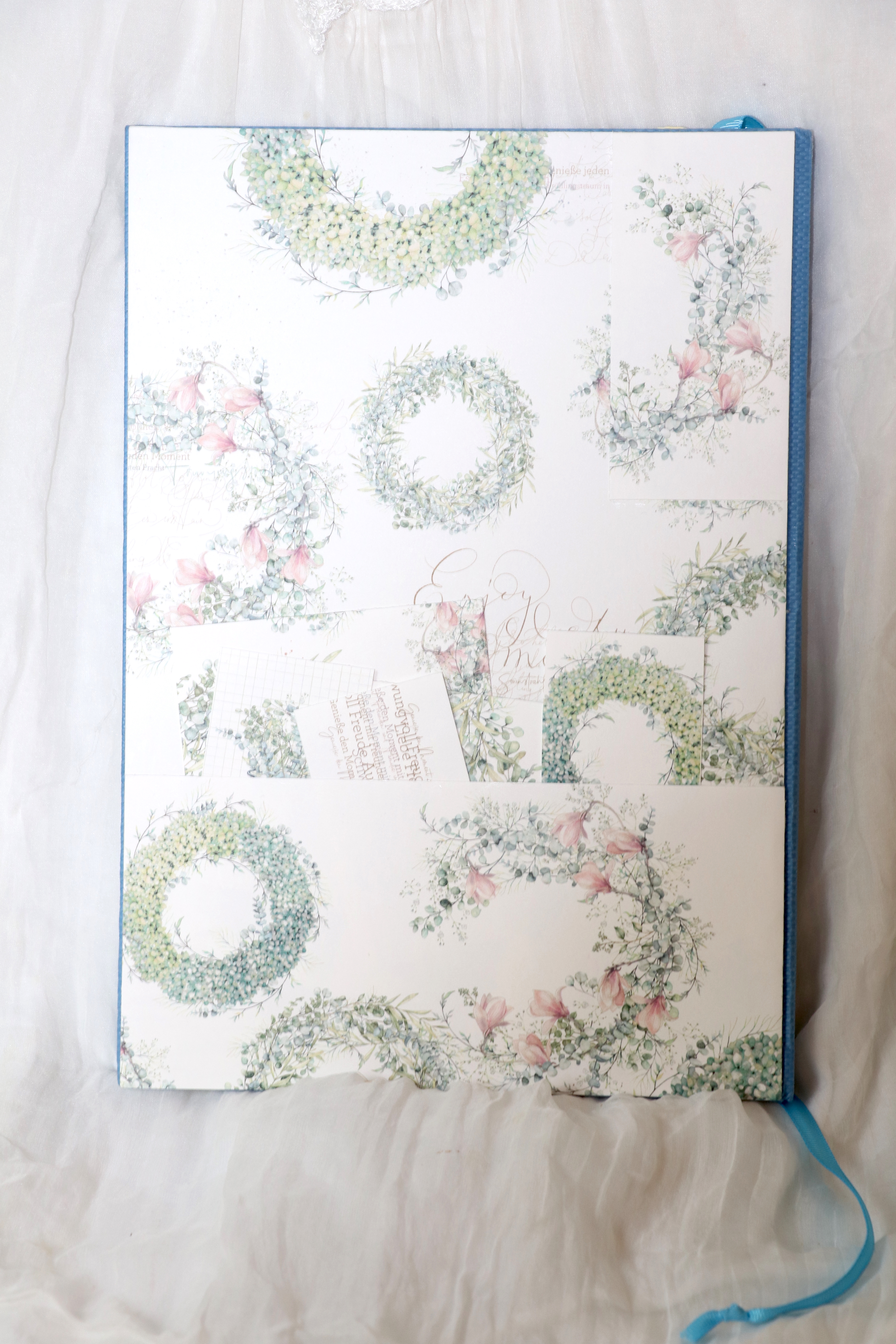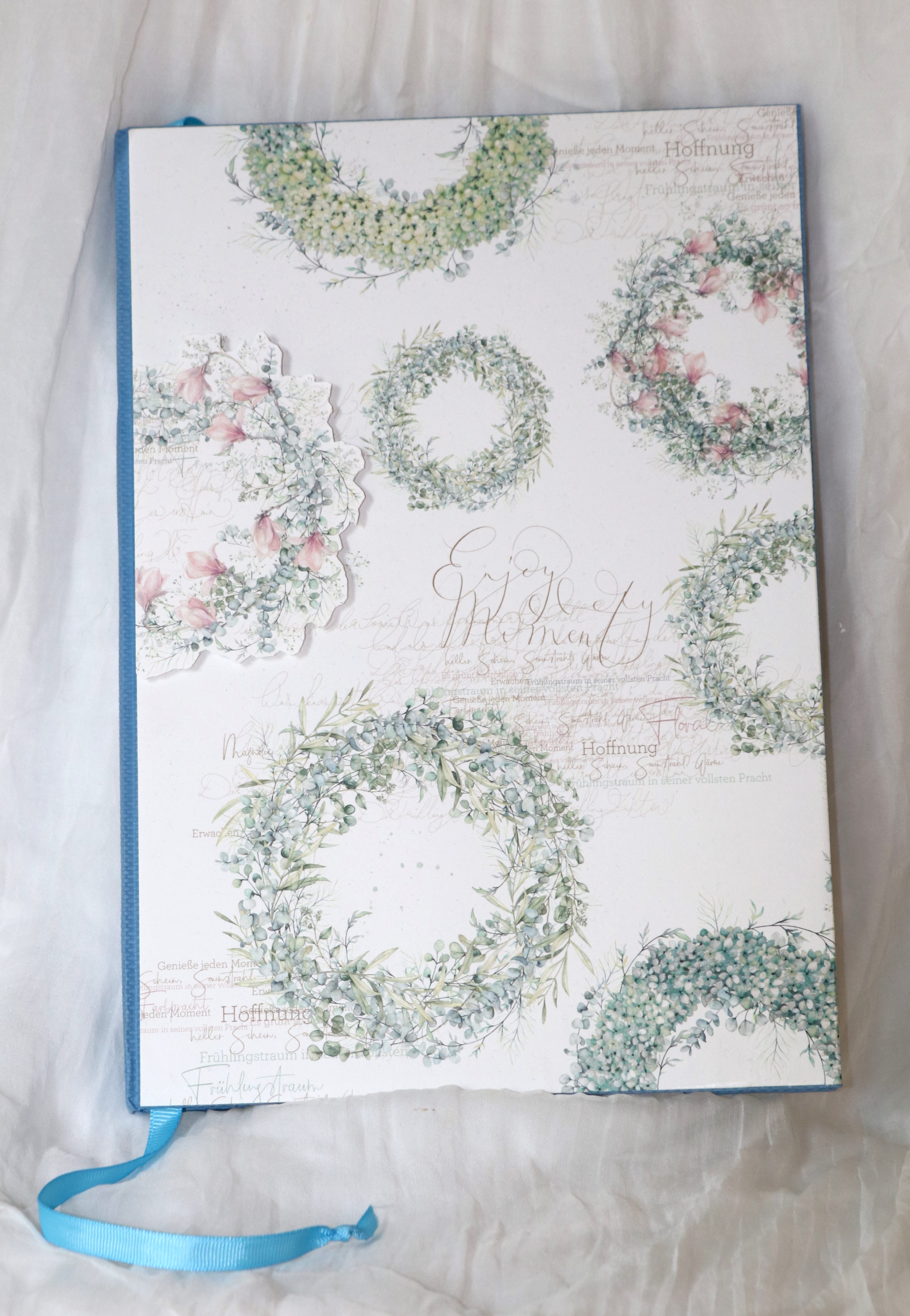 Wunderschönes, eingebundenes Buch mit Kränzen und Magnolien .