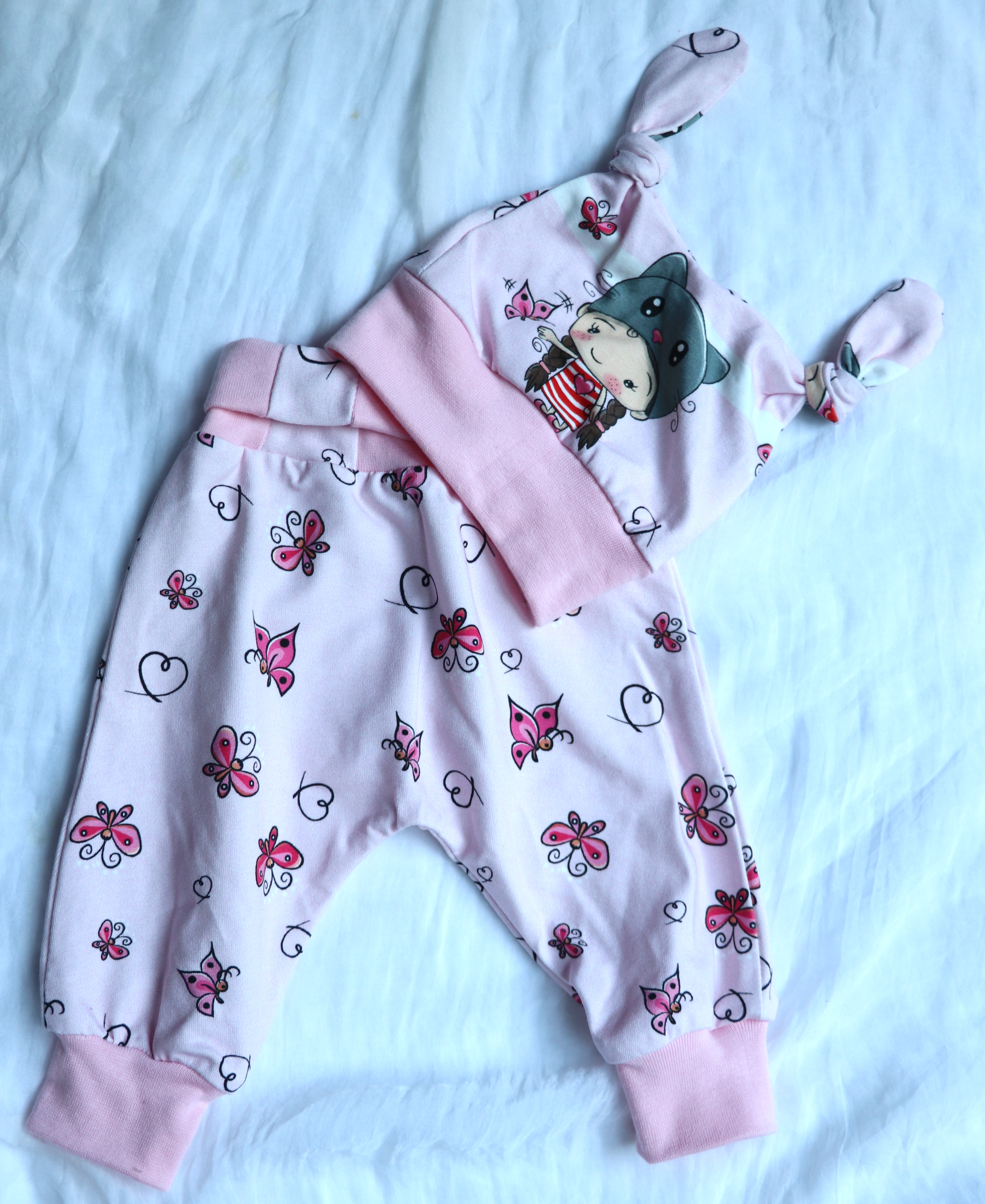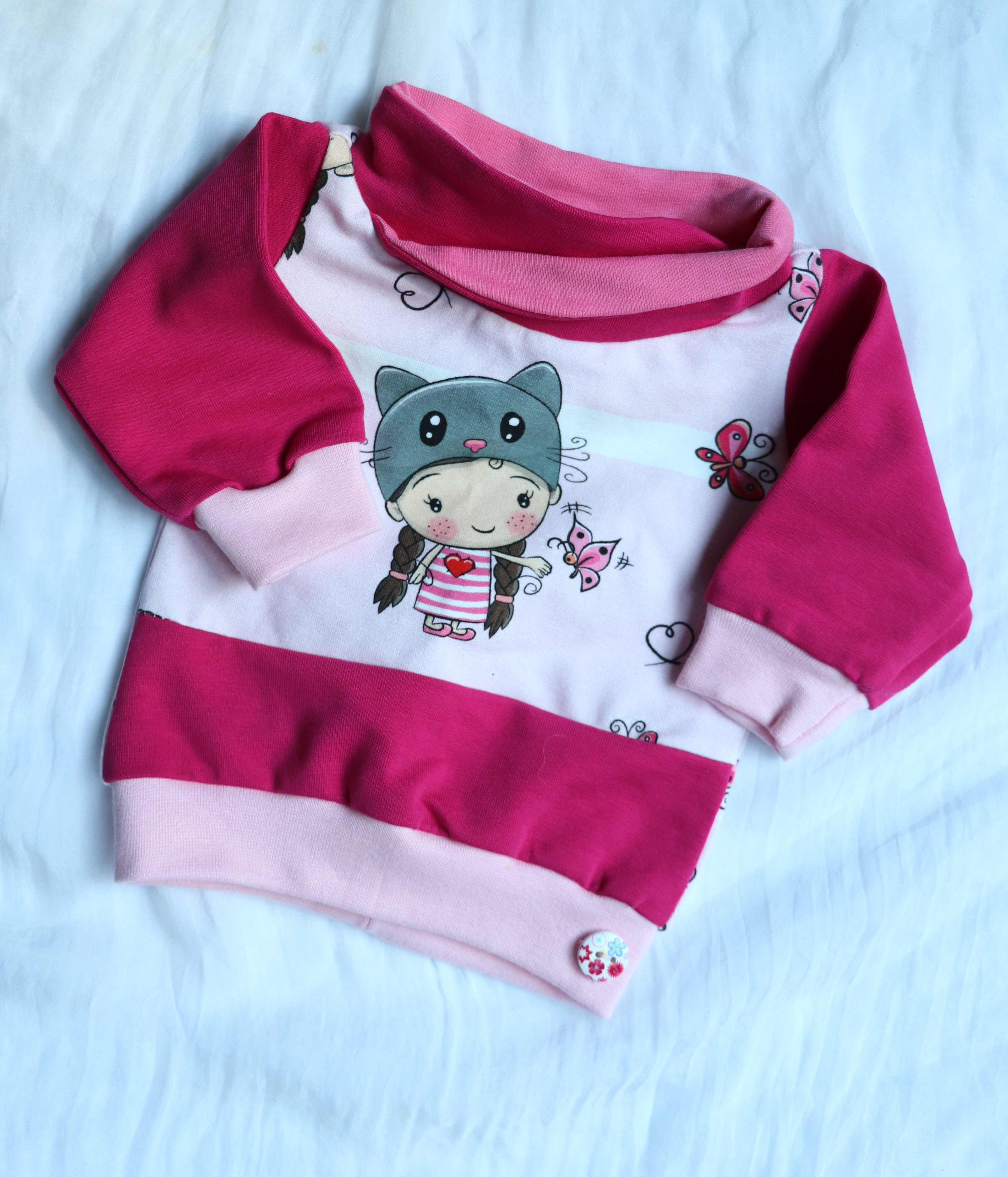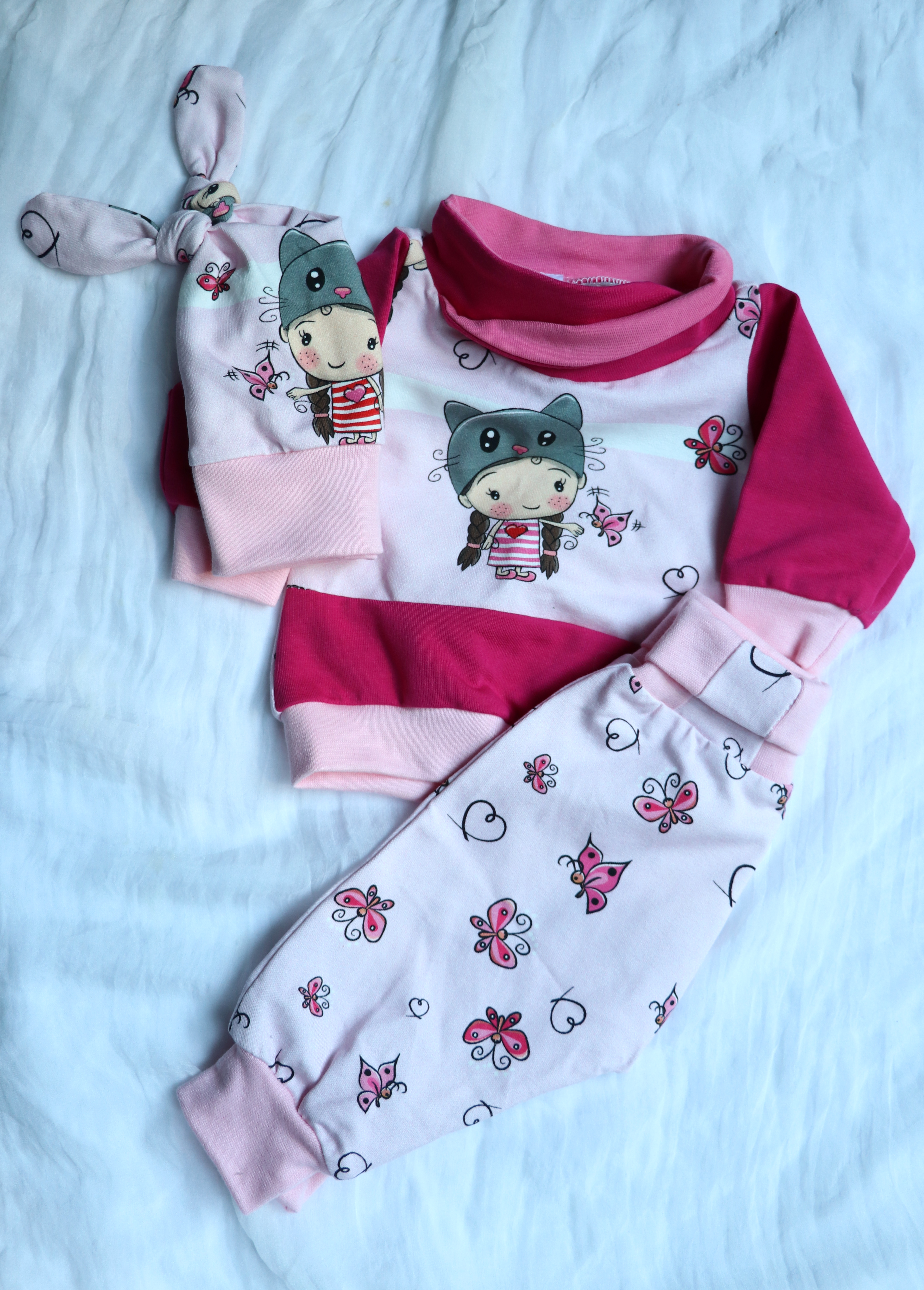 Süsses Kombi aus Hoodie, Höschen und Mütze mit Katzenmädchen.