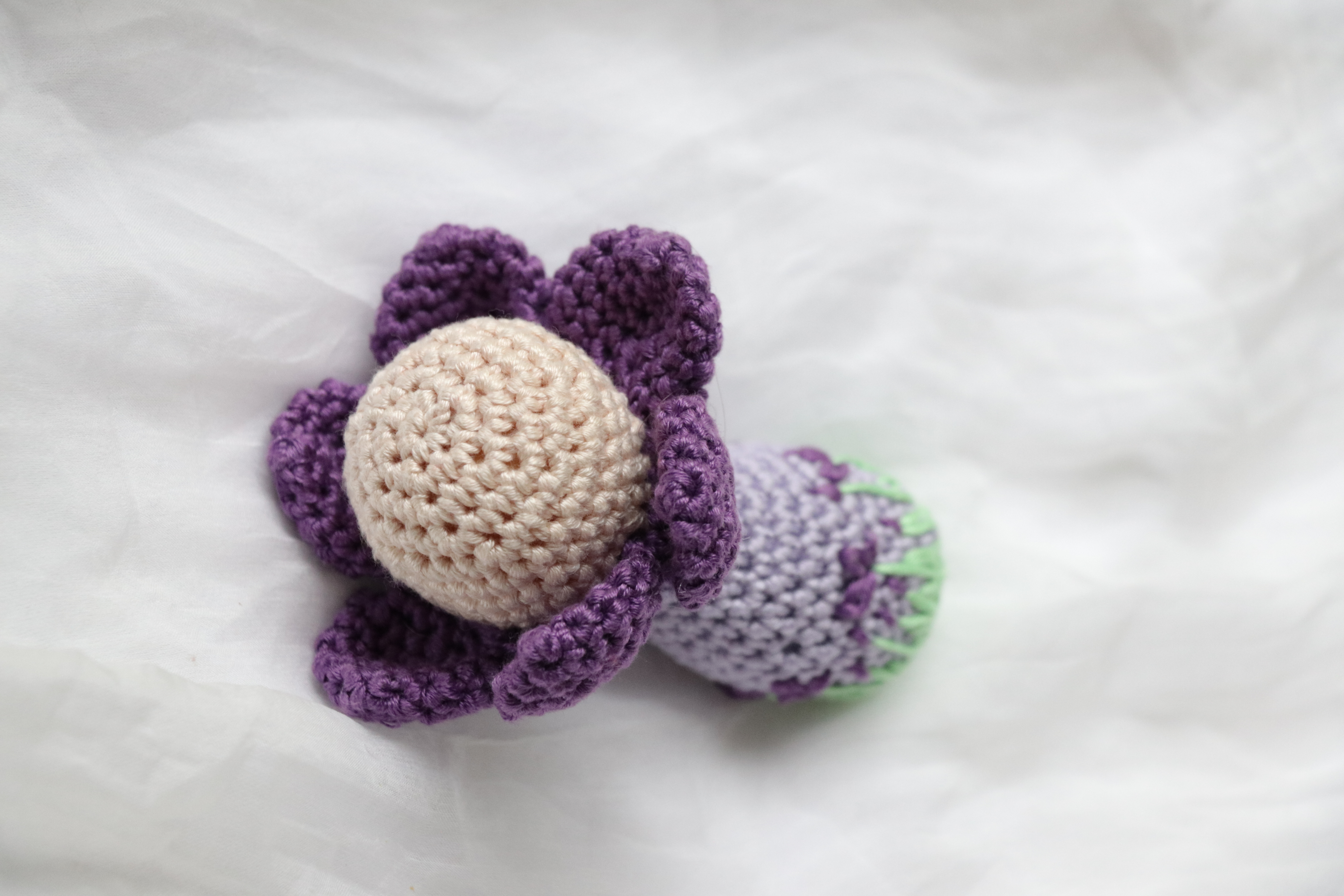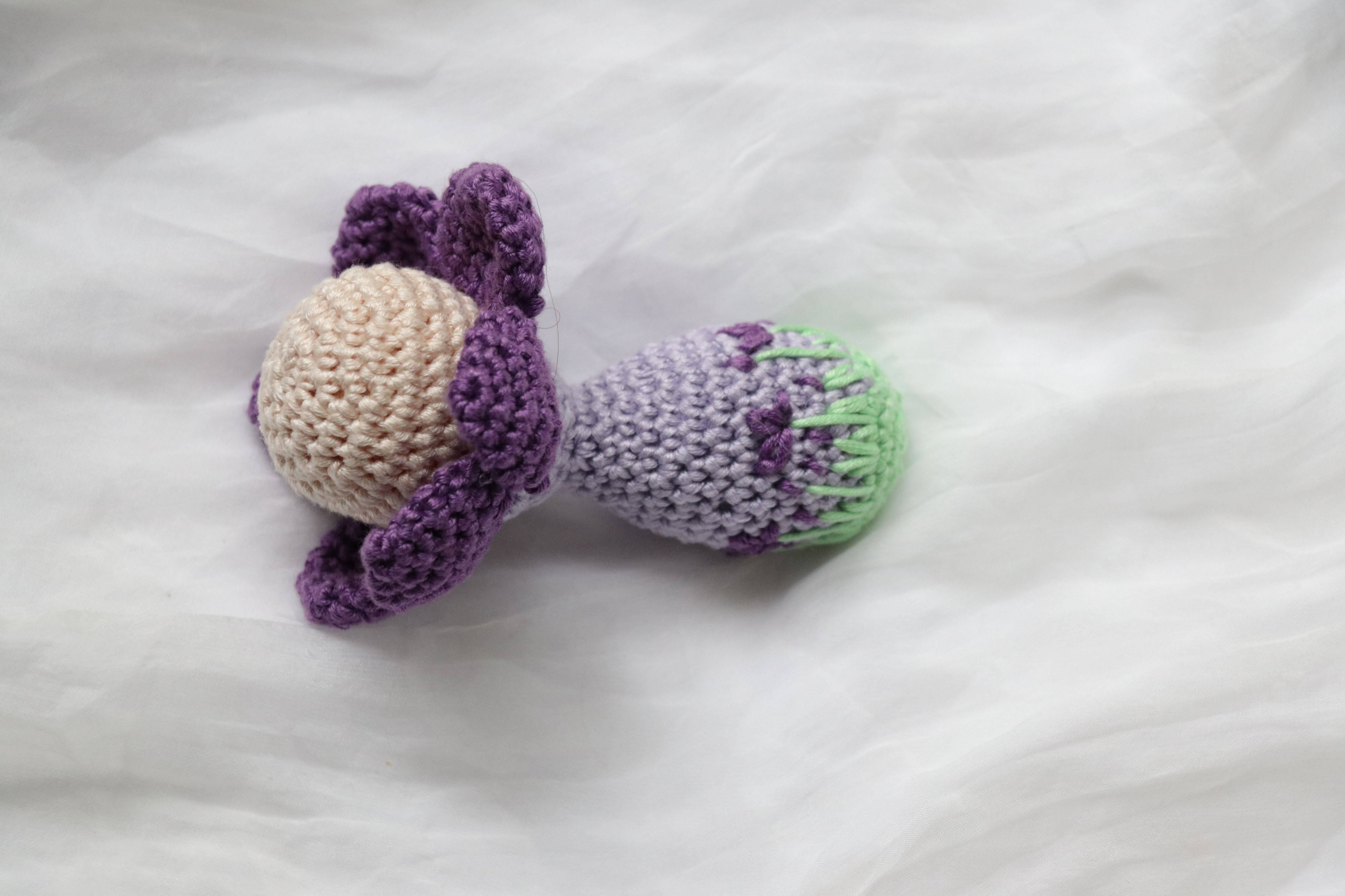 Gehäkelte Rassel „Blume viola“. Hergestellt aus Bauwollgarn.